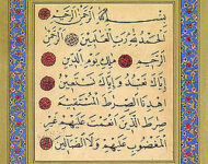 1. Открывающая («Аль-Фатиха», посланная в Мекке, 7 аятов) 1. Во имя Аллаха Милостивого, Милосердного. 2. (Вся) Хвала Аллаху — Господу миров, 3. Милостивому